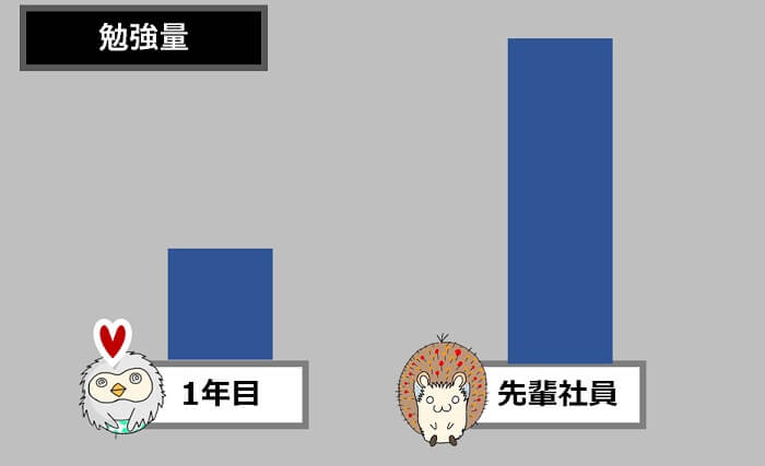 これは何となくのイメージですが、後輩の勉強量が3くらいなら、先輩社員は7くらい勉強しないといけません。