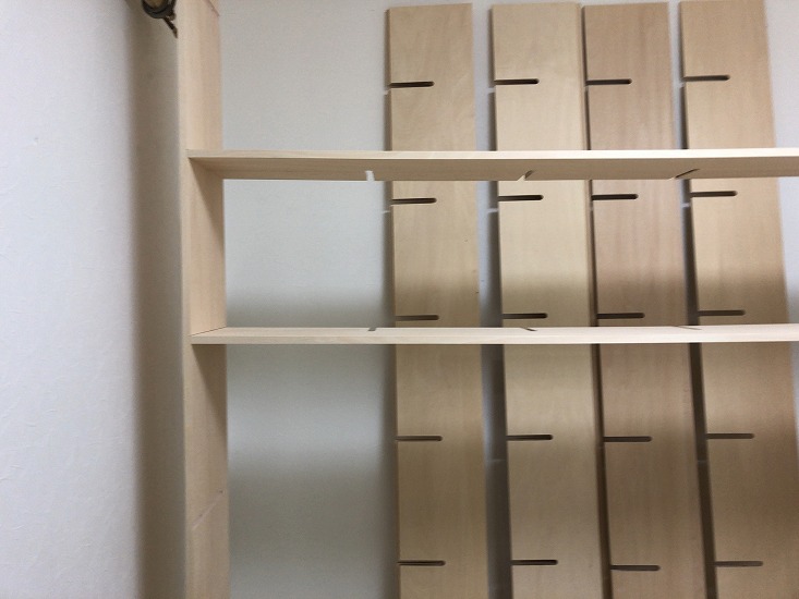 横板を全て設置したら、後ろに準備した縦板を切り込みに合わせて入れ込んでいきます。