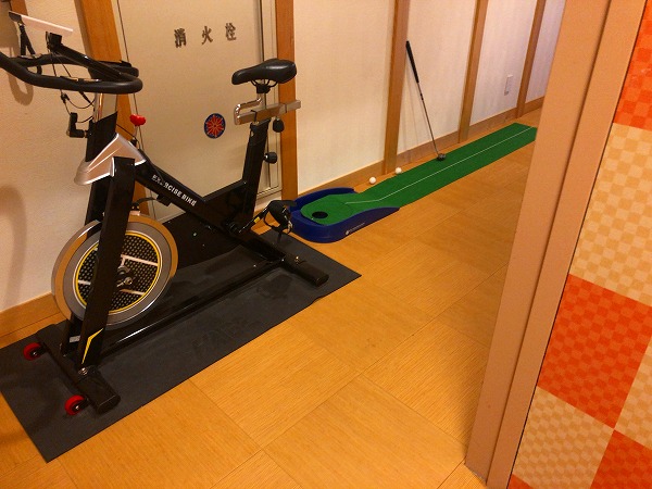 何故かルームバイクとパットゴルフが…。海外から来た旅行者がゲラゲラ笑いながら楽しんでました