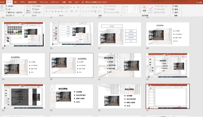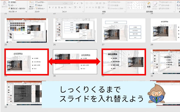 自分が作ったパワポ資料をジッと眺めてみて、考えたストーリーをもとにスライドの入れ替えをしてみます。