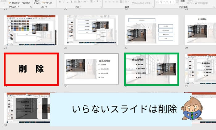 不必要なスライドが目についてきます。この場合は必要ないものなので削除しましょう