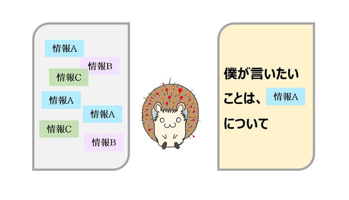 ここで大切なのは、言いたいことに必要な情報です。関係のない情報は集めたらダメ!