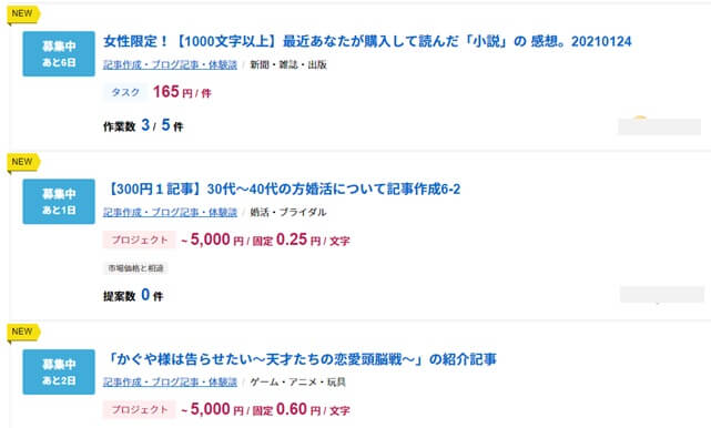 小説について書いて下さいとか、婚活について書いて下さいみたいに、ジャンルは多種多様なので、自分が書けそうな案件を選んで、書いて提出するだけ。