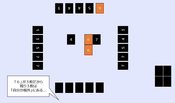 ここで確率が高いのは「6」のドメモナンバーです。3枚は確実に「自分」か「外」にあります。
