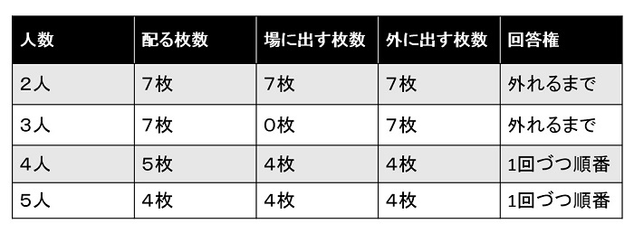 画像でアップしたように、プレイヤーの数によってルールが多少変化します。