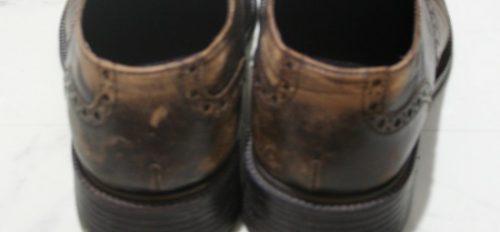 靴べらがないと、100%かかとが痛みます。そして1万そこそこの革靴の場合、色が落ちます。こんな感じ。